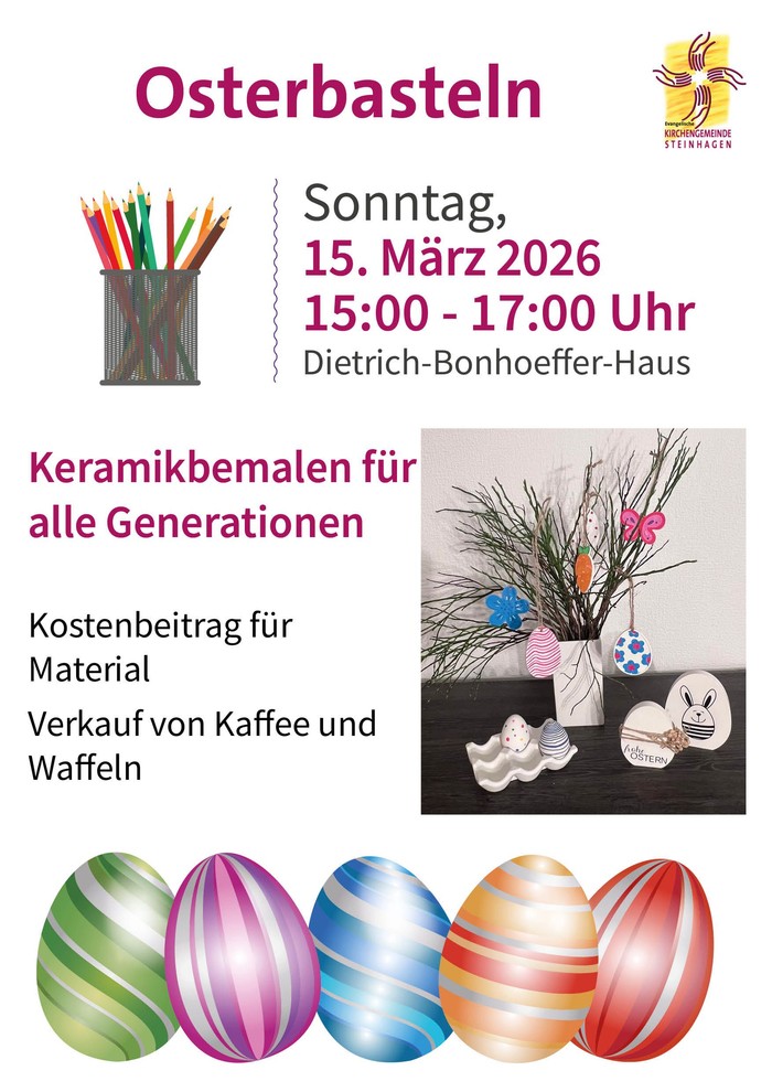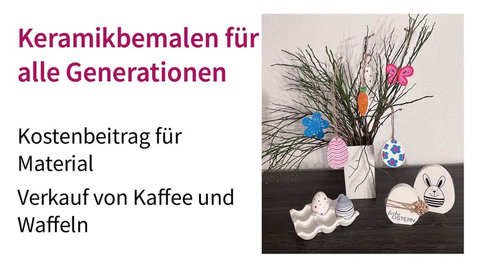 Am Sonntag, von 15:00 - 17:00 Uhr können Sie im Dietrich-Bonhoeffer-Haus Keramik bemalen. Die Keramik ist bereits gegossen und kann mit unterschiedlichen Materialien bemalt werden. Daneben ist auch Zeit für nette Gespräche und Kaffee und Waffeln. Bitte denken Sie daran Bargeld für Waffeln, Kaffe und Materialkosten mitzubringen.