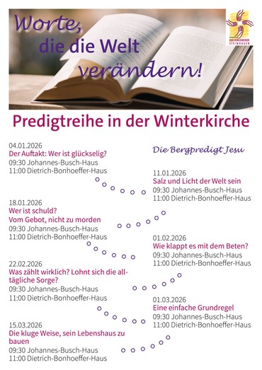Die Bergpredigt ist kein frommer Traum, sondern eine mutige Lebensansage. In unserer Predigtreihe fragen wir: Wie geht „anders leben“ mit Jesus heute? In diesem Zeitraum feiern wir die Gottesdienste statt in der Dorfkirche im DBH.