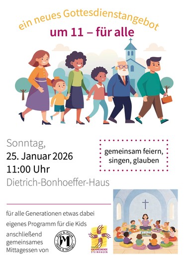 Im Jahr 2026 hat sich die Evangelische Kirchengemeinde viel vorgenommen. Am Sonntag, den 25. Januar um 11 Uhr startet im Dietrich-Bonhoeffer-Haus ein neues Gottesdienstformat. Das besondere in diesem Format: Es ist für alle Generationen was dabei. Nach einem gemeinsamen Beginn startet ein eigenes Programm für Kinder und Konfis. Bei den Erwachsenen wird Pfarrer Dr. Marcel Friesen mit Steinhagens ehemaliger Bürgermeister Klaus Besser über die Jahreslosung sprechen. Am Ende kommen alle wieder zusammen für einen gemeinsamen Abschluss und ein kostenloses Mittagessen von Mann & Metzger.