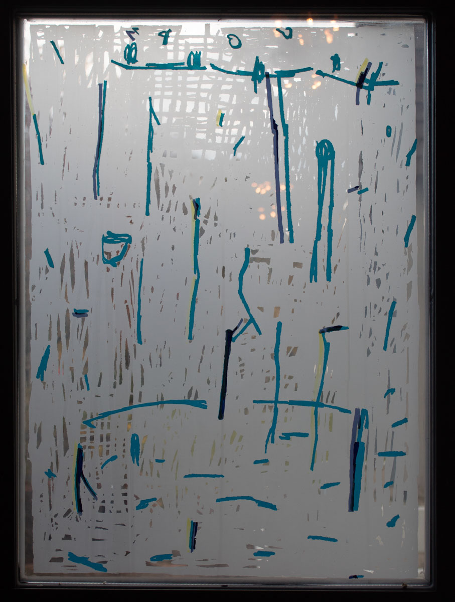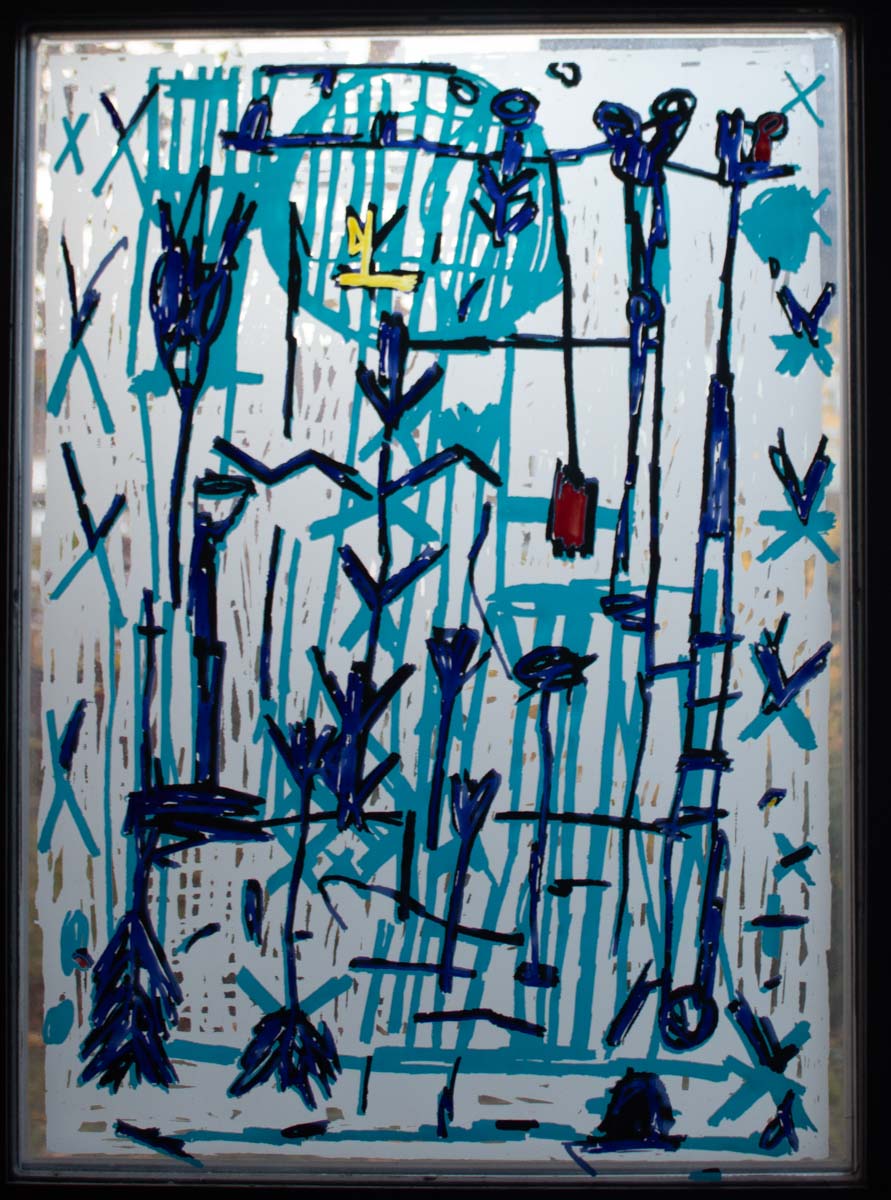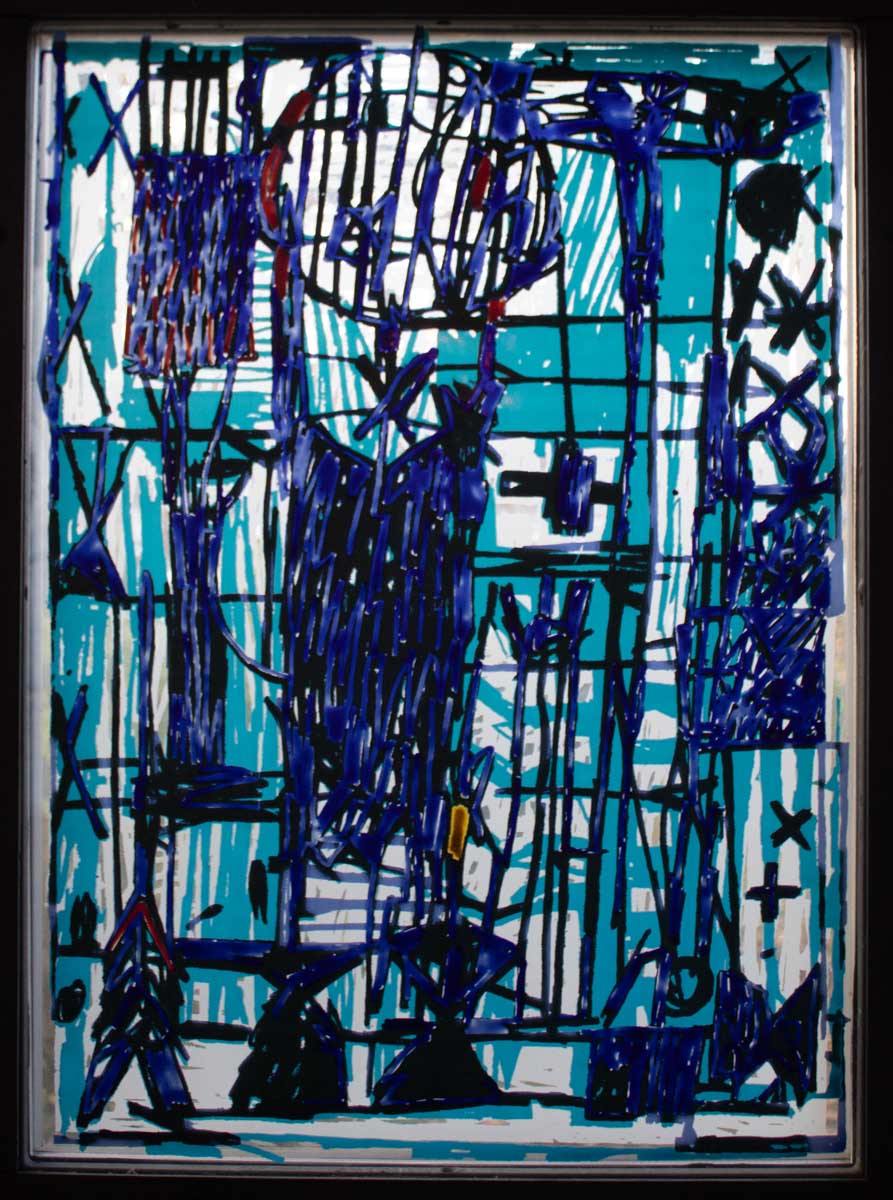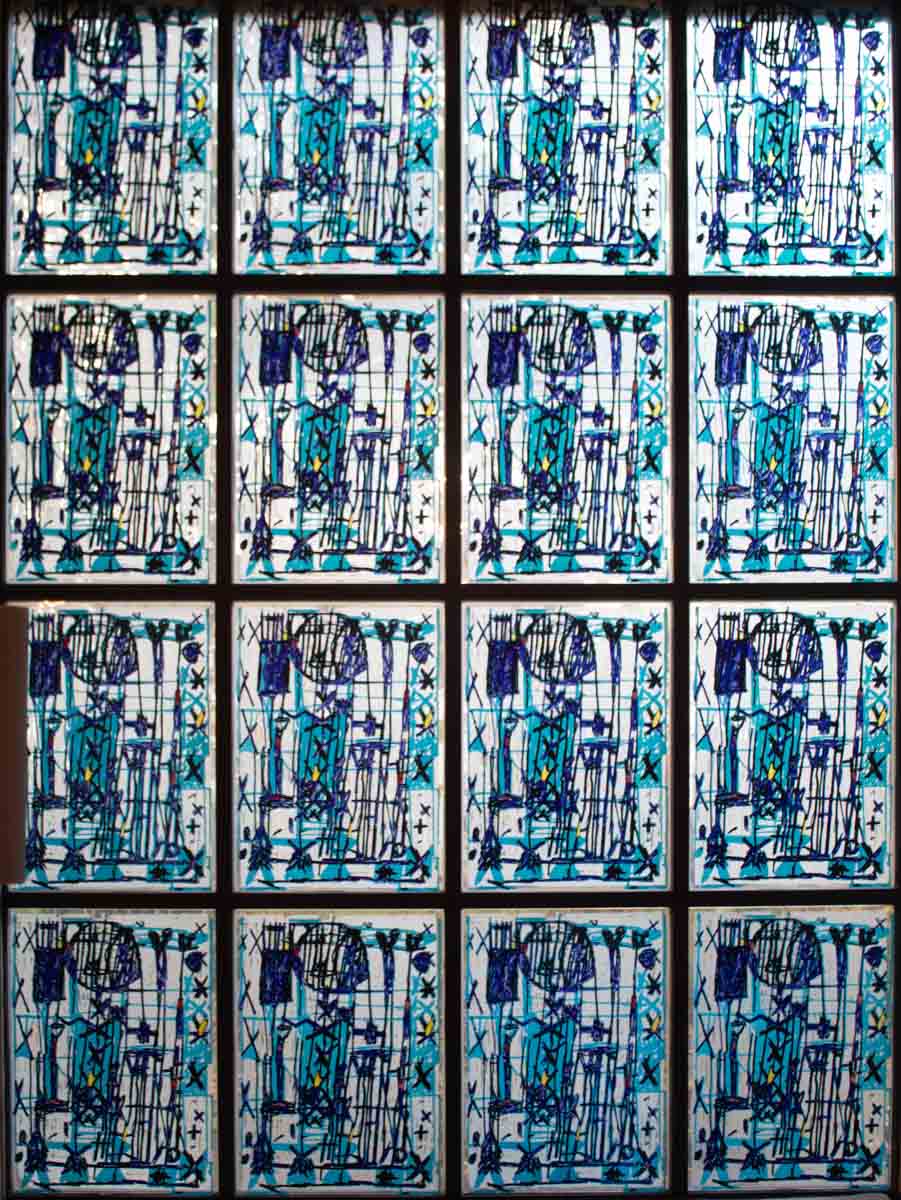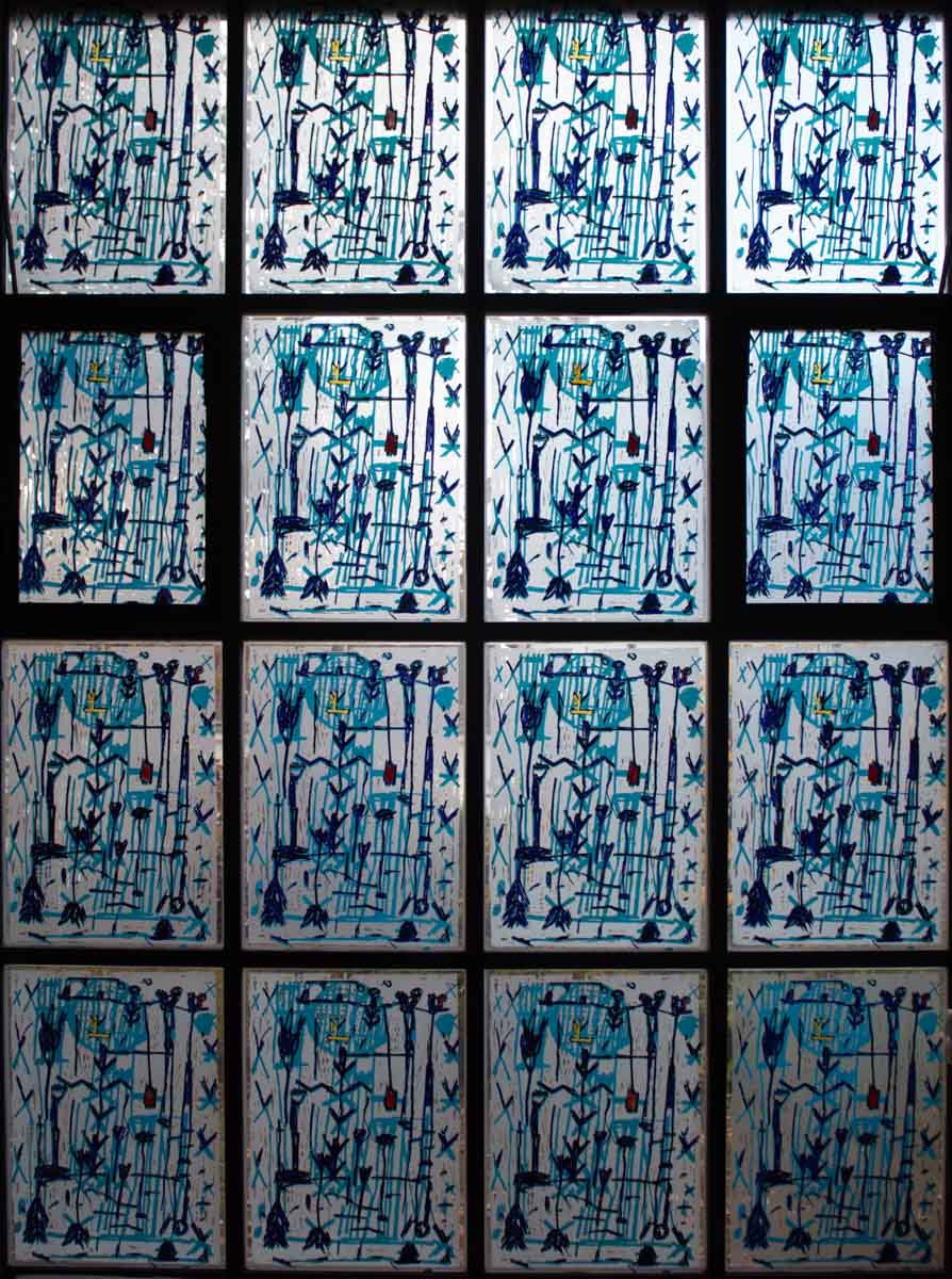 Anders als bei den sieben Fenstern im Kirchsaal kann man dort Buchstaben und Wörter oder Wortfetzen entdecken.