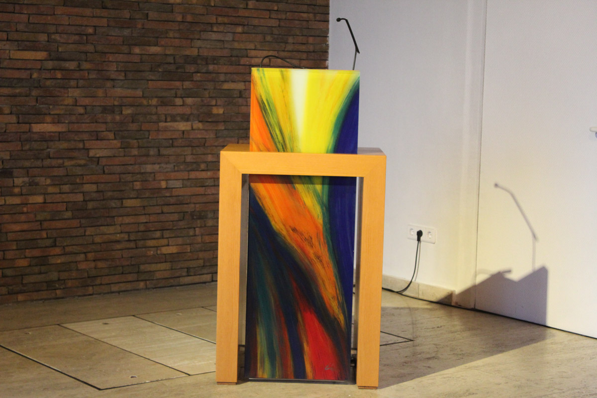 - Später nahm Elisabeth Willnecker diesen Gedanken auf. Ihr Glasbild für die 2011 eingeweihte Kanzel trägt den Titel "Gottes Wort ist wie Licht in der Nacht" und reagiert gestalterisch auf die Fenster im Kirchsaal.