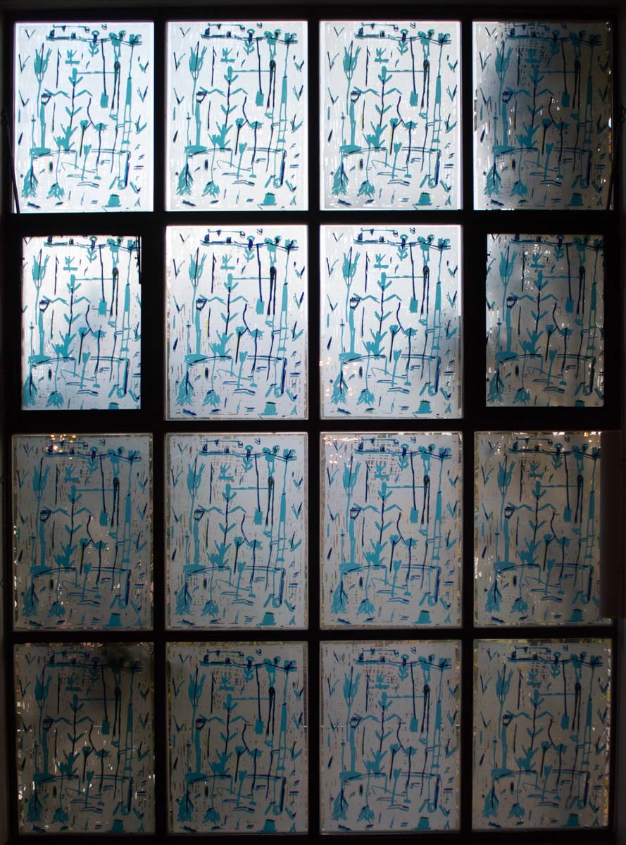Jede der sechzehn kleinen Glasscheiben eines Fensters ist gleich gestaltet.